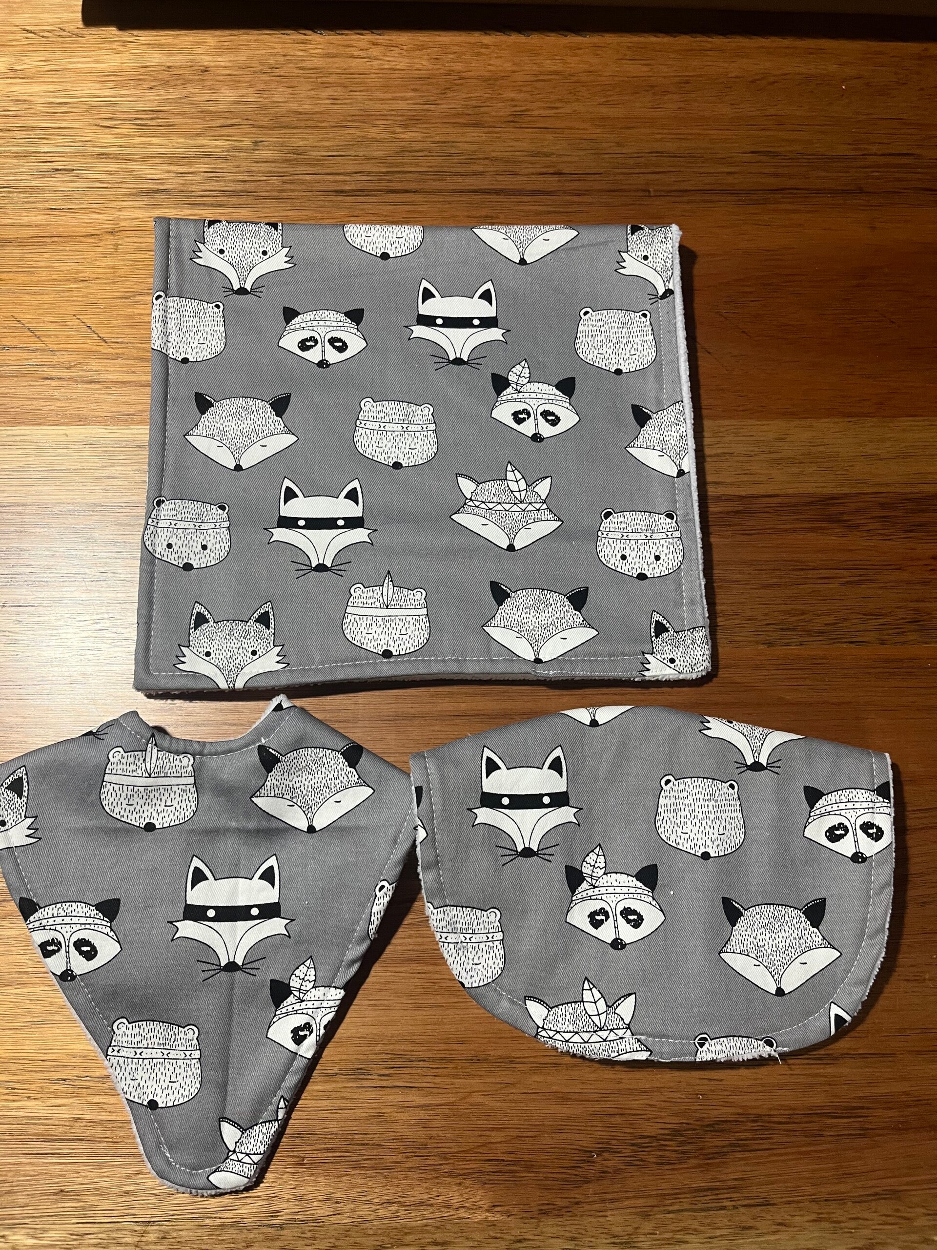 We offer a range of different baby sets and singular items. Ranging from Burp cloths and Dribble bibs, to, baby Bibs and dummy bags.